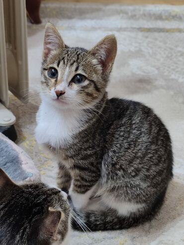 Gözəl zolaqlı balaca pişik balası - Cins: ev pişiyi (tabby/zolaqlı) - Rəng: boz-qara zolaqlar, ağ sinə və pəncələr - Yaş görüntüyə əsasən: balaca, körpə - Xarakter: sakit və mehriban, qucaqda yatm...