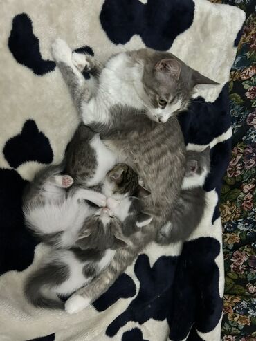 Sevimli pişik balaları - Rəng: krem-boz və ağ qarışıqlı, biri üçrəngli (krem/boz/ağ) balaca - Yaş: fotolardan göründüyü kimi bala mərhələsində - Xasiyyət: mehriban, insanla ünsiyyətə açıq, qucaq v...