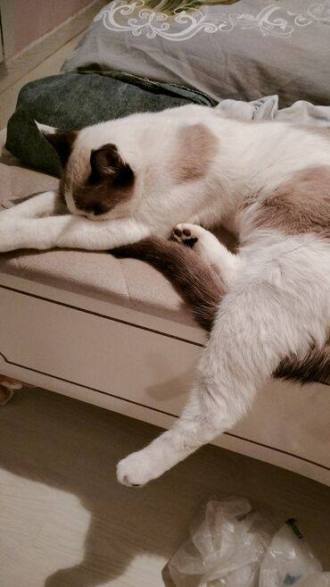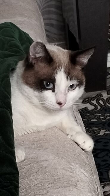 Boz-ağ rəngli ev pişiyi - Qısa tüklü, zərif və ahəngdar bədən quruluşu - Boz kürk, sinə və burun hissəsində ağ naxış, ağ pəncələr - Sarımtıl-golden gözlər, çənəaltı və bığ hissəsi ağ - Yaşıl rəngl...