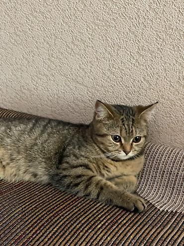 Britaniya tipli zolaqlı pişik balası - Cinsiyyət: ehtimalən dişi (boynunda çəhrayı lent) - Rəng: qara-qəhvəyi zolaqlı (tabby), açıq krem altlıq - Gözlər: iri, mavi-boz tonlarında - Qulaqlar: kiçik...