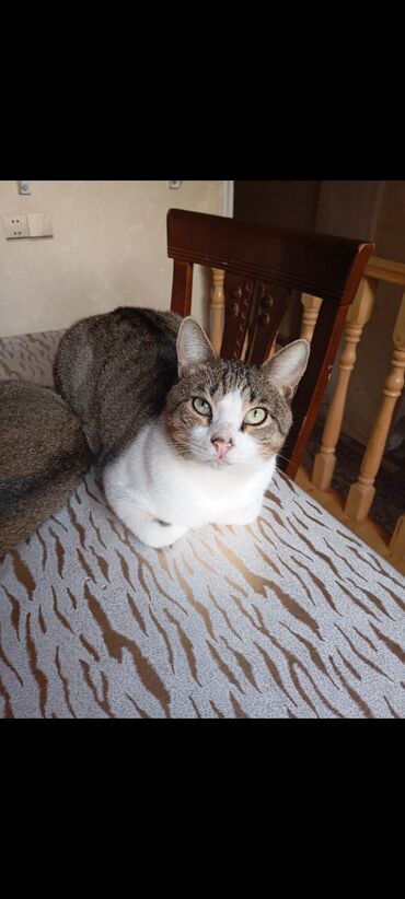 Məhsul: Ev pişiyi - Cins: Qarışıq (tabby-ağ rənglərlə) - Rəng və xəz: Boz-qəhvəyi zolaqlı kürk, sinə və pəncələrdə tam ağ, burnu açıq çəhrayı. Orta uzunluqda yumşaq xəz. - Gözlər: Açıq yaşıl/sarı ...