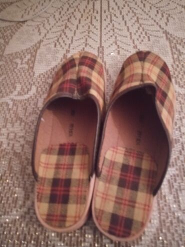 - Ev üçün kişi çəkmələri (şip-şap): Qapalı burunlu model, üst hissə klassik xalı-çəkmə naxışlı (sarı-qəhvəyi-qırmızı rəngli dama). İçlikdə eyni naxışlı yumşaq tabanlıq, yüngül və rahat, səssiz gediş üçün.