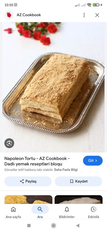 - Napalyon (Napoleon) tortu: çoxqatlı yağlı xəmirdən bişirilmiş laylar, vanilli krem ilə arası doldurulmuş, üstü xırda qırıntılarla bəzədilmiş. Yüngül, ətirli və laylar aydın görünüşlü.