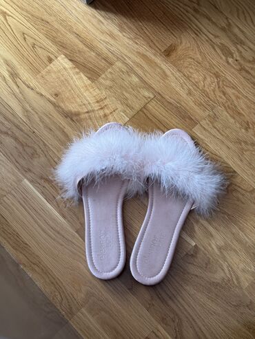 Tüklü ev terlikləri – pudra/çəhrayı ton - Model: açıq barmaqlı, kaydırak tipli - Üst hissə: yumşaq süni tüklü dekor (bol, həcmli) - Daxili və altlıq: tamamilə plyuş/yorğanvari yumşaq parça, ayağı ...