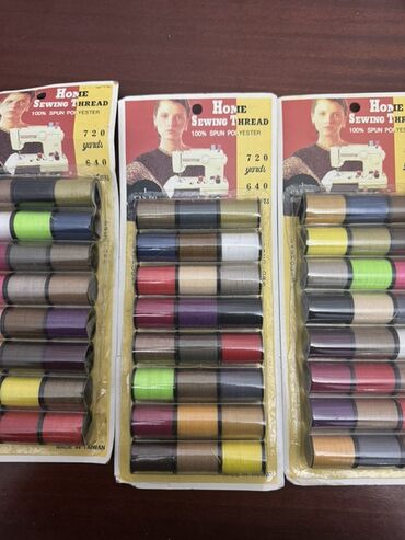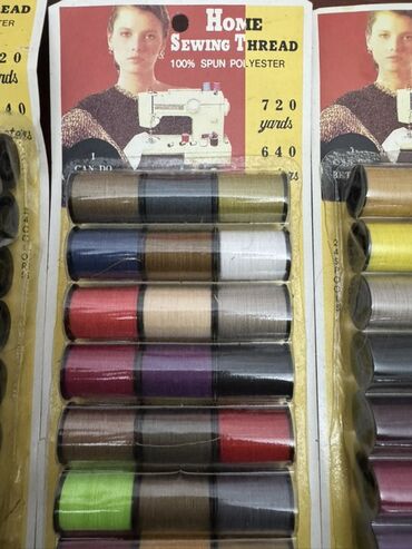 - “Home Sewing Thread” 100% spun polyester tikiş sapları dəsti (çoxrəngli bobinlər). Karta üzərində 720 yards/640 yards göstəriciləri var.