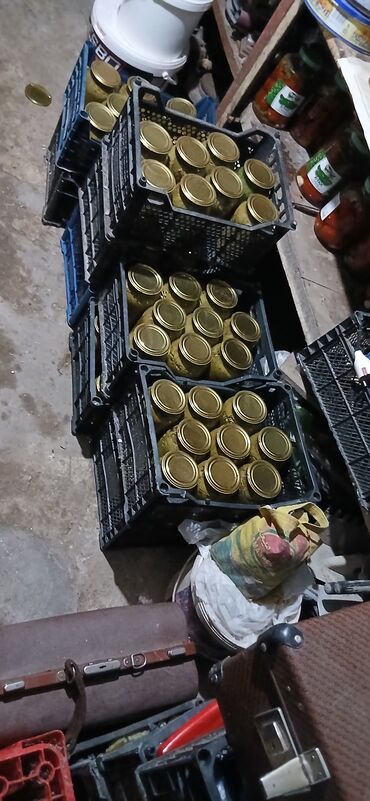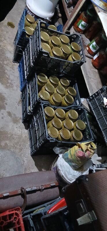 - Yan raflarda digər şüşə konservlər görünür; məhsul eyni toplu hazırlığın bir hissəsidir.
