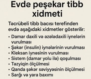 Peşəkar tibb bacısı xidmətləri - Evdə və ya stasionarda iynə, sistem (damcı) qoşulması və müşahidə - Venadaxili, əzələiçi və dərialtı inyeksiyalar - Qan təzyiqi, nəbz, temperaturun ölçülməsi və nə...20 AZN