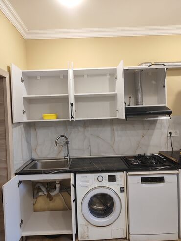 - Üst dolablar: parlaq ağ fasadlı, qapalı/raf sistemi, hava çıxışı üçün yer ayrılıb (mühərrikli aspirator mövcuddur).