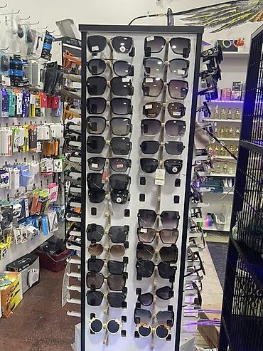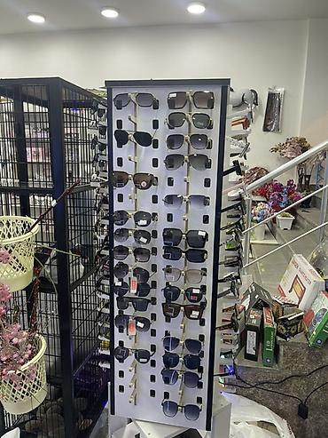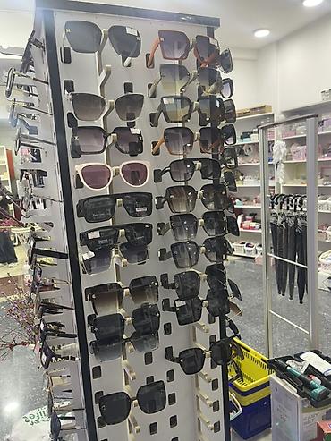 Məhsul: Dördüzlü, fırlanan nümayiş stendi və üzərində geniş çeşiddə gün eynəkləri.
