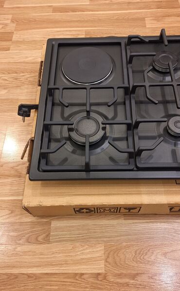 EZEL quraşdırılan qarışıq soba paneli - Yanacaq növü: 3 qaz ocağı + 1 elektrikli disklik (solda) - İdarəetmə: sağ zolaqda 4 ədəd fırlanan mexaniki düymə - Alov mənbələri: fərqli ölçülü üç qaz gözü...