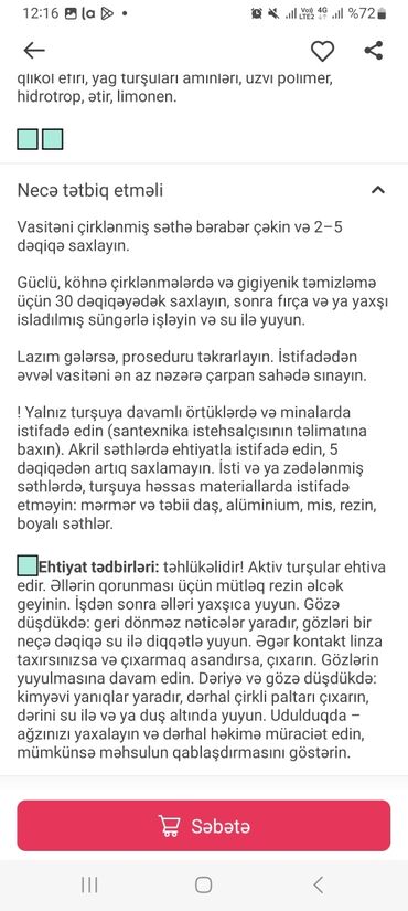 – İsti/zədələnmiş səthlərdə, turşuya həssas materiallarda istifadə etməyin: mərmər və təbii daş, alüminium, mis, rezin, boyalı səthlər.