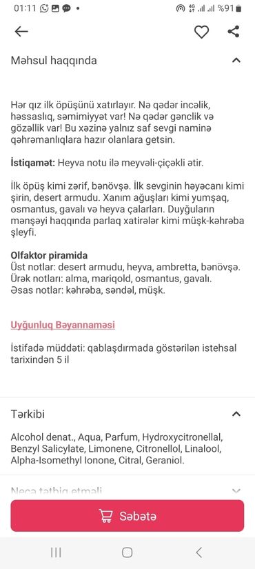 - Aroma xarakteri: ilk öpüş ab-havası ilə yüngül, şirin və çiçək-meyvə notları; gündəlik istifadə və romantik görüşlər üçün uyğundur1