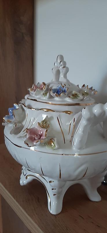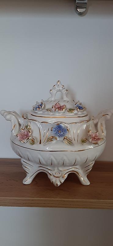 Ağ rəngdə, qapaqlı, keramik şəkər qabı. Qabın üzərində müxtəlif rəngli güllər və qızılı rəngli haşiyələr var. Qab dörd ayaq üzərində dayanır və yan tərəflərində tutacaqları var. Dekorativ və praktik əşya kimi istifadə edilə bilər.