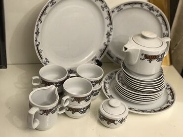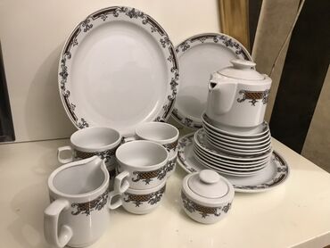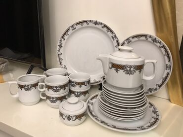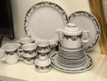 Məhsul: Çex istehsalı süfrə servisi (Gəncə) Təsvir: - Klassik ağ porselen üzərində zərif çiçək naxışları - Tam süfrə dəsti: böyük oval süfrə boşqabları, dərin şorba qabları, xörək boşqabları, sala...