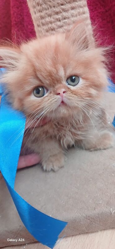 Şirin pişik balası – uzun tüklü, şaftalı/rəngli (zəncəfil) rəng çalarında, yumru üz quruluşu və böyük yaşıl-boz gözlər. Burnu qısa, tükləri sıx və yumuşaqdır. Boynunda mavi lent aksesuarı ilə çəkil...