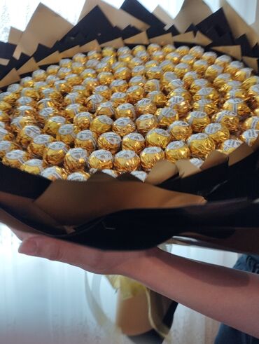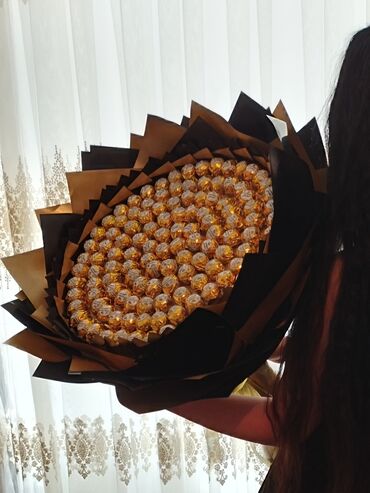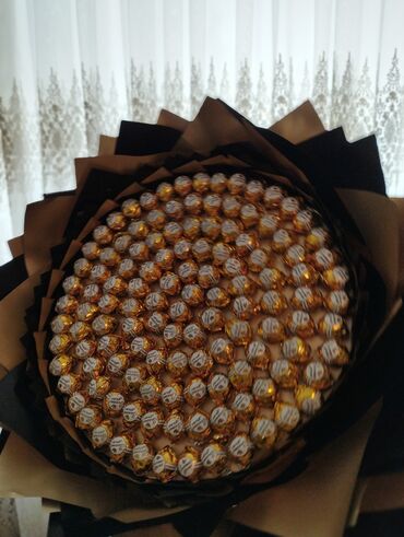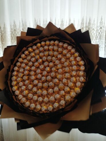 - Dizayn: dairəvi, sıx yerləşdirilmiş konfetlər; qara və qızılı rəngdə çoxqatlı kraft kağız ilə bəzədilmiş, iri gül forması effekti.