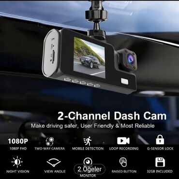 İki kameralı avtomobil qeydiyyat kamerası – Ön və salon çəkilişi. 32 gb yaddaş kartı Ön 1080P və salon 720P görüntü ilə gündüz və gecə çəkilişi. 170° geniş bucaq, G-sensor, hərəkət aşkarlama, dövr...