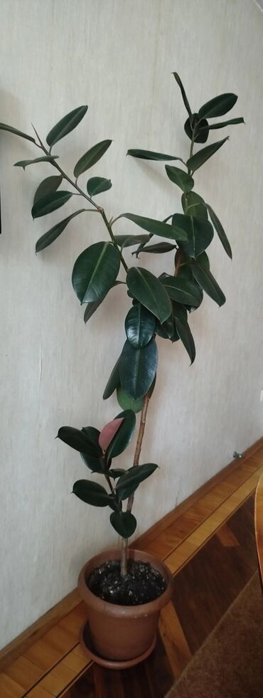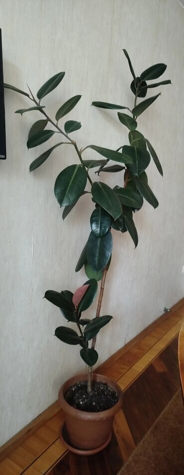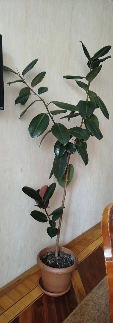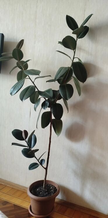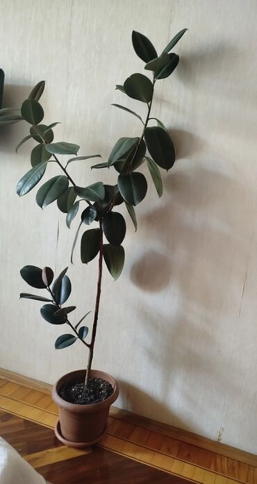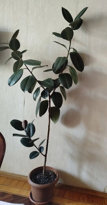 Ficus elastica (rezin ağacı) – iri, parlaq tünd-yaşıl yarpaqları ilə dekorativ otaq və eyvan bitkisi. - Təxminən 1,7–2 m hündürlükdə, birgövdəli formadadır, iri diametrli yarpaqlar. - Plastik dibç...