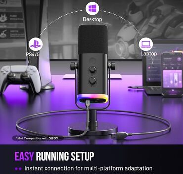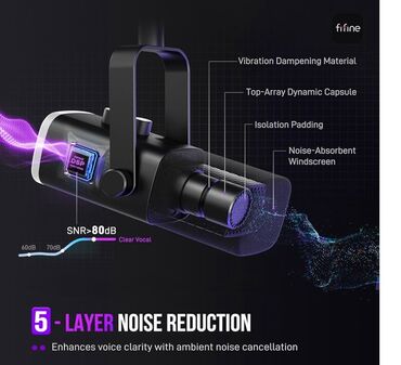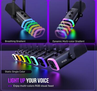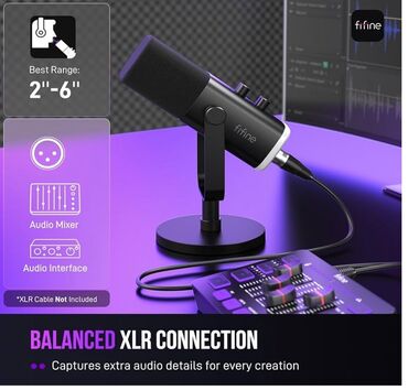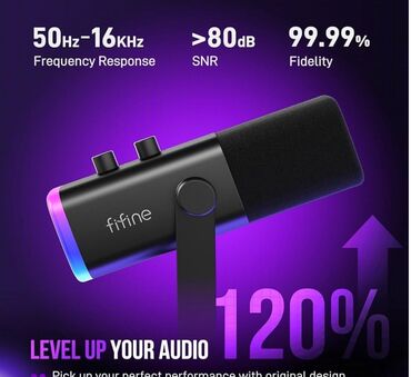 Fifine Ampligame USB və XLR bağlantılı oyun mikrofonu. RGB işıqlandırma, səs səviyyəsi tənzimləyicisi və səs-küyün azaldılması funksiyası ilə təchiz olunmuşdur. Masaüstü, laptop, PS4/PS5 ilə uyğun gəlir və yüksək keyfiyyətli səs təmin edir. Məhsul qara rəngdədir və möhkəm stend üzərində dayanır. Studiya keyfiyyətində səs yazmaq üçün XLR kabel vasitəsilə audio mikserlərə və audio interfeyslərə qoşula bilər.