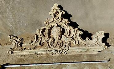 Скульптурный фронтон над дверью. к.19-нач.20 века. Состояние - отличное. материал - керамика. Размеры - длина1 м, высота гребешка - 30 см.