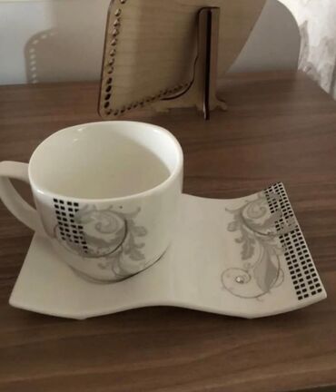 6 ədəd çay/qəhvə fincanı dəsti. - Material: nazik porselen. - Rəng və dizayn: ağ əsas, üst hissədə gümüşü kənar xətt; çəhrayı üçölçülü naxışlı zolaq və onun üstündə sarı dekorativ haşiyə. - Forma:...