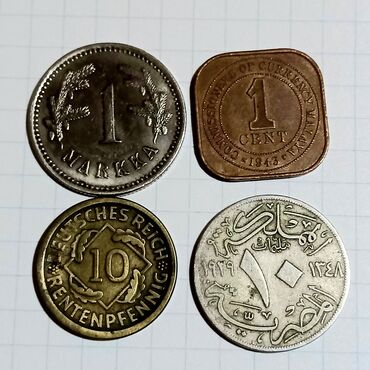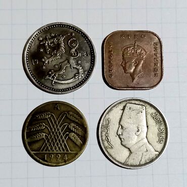 Finlandiya 1 marka 1921. Malaya 1 cent (4 künc) 1943. Almaniya 10 pfennig 1924. Misir 10 mils 1929.