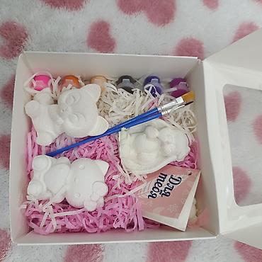 Uşaqlar və böyüklər üçün rəngləmə dəsti – gips fiqurlar Məhsulun tərkibi: - Ağ gipsdən hazırlanmış müxtəlif fiqurlar: güllərdən ibarət buketlər, ayı və pişik balası, kukla/qız fiqurları, ürək və ç...