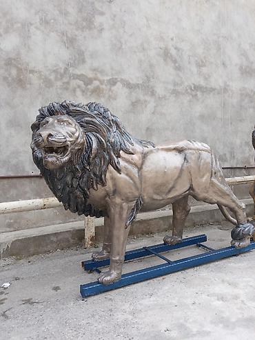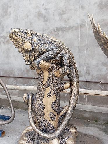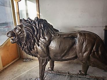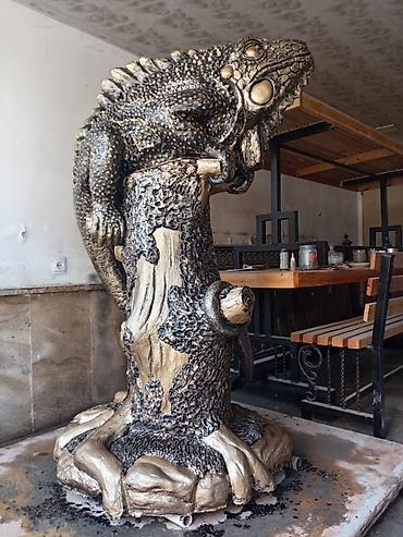 Taxta heykəl – pələng fiquru - Material: bərk ağac (təbii budaq-düyün fakturalı), tamamilə əl oyma. - Kompozisiya: qayalıq/odun kökü üzərində irəli atılan pələng; bir tərəfdə dairəvi kürə elementi...
