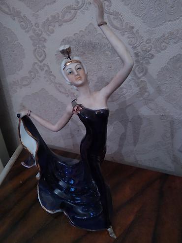 Porselen fiqur – milli geyimli qadın təsviri - Material: parlaq şirli porselen - Rənglər: ağ əsas üzərində qırmızı, narıncı, mavi və qəhvəyi naxışlar - Təsvir: toxunmuş kəmərli, milli naxışlı don ...