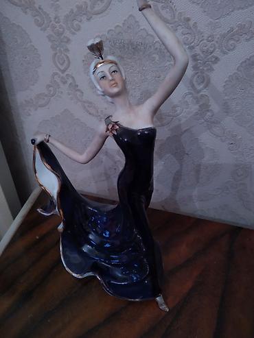 Porselen fiqur – klassik üslubda xanım obrazı. - Material: yüksək keyfiyyətli parlaq porselen - Rənglər: tünd göy üst geyim, ağ naxışlı ətək, qızılı detallar - Bəzəklər: əl işi güllərdən hazırlanm...