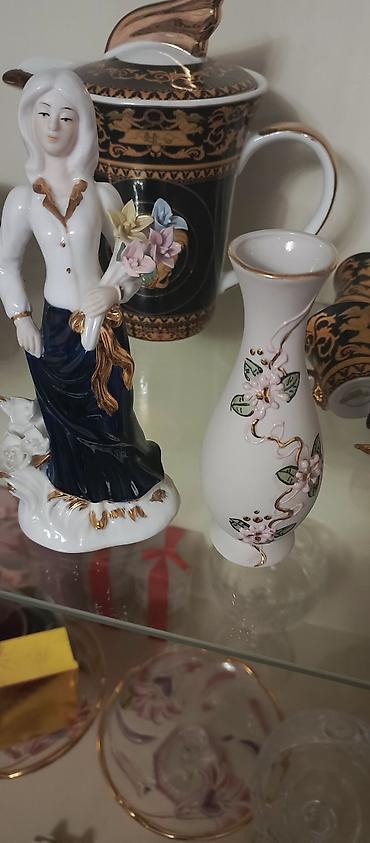 Məhsul: Porselein və şüşə dekor kolleksiyası - Porselein fiqurlar: • Milli naxışlı donlu qadın heykəlciyi (ayaqyalın, əlində üzük saxlayan poza, qırmızı haşiyəli ətək, detallarda qızılı işləməl...