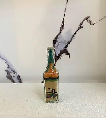 - Dizayn: qum layları ilə yaradılmış səhralı motiv; butulkanın hər tərəfində qum təsviri (dəvə silueti və rəngli üfüqi laylar)