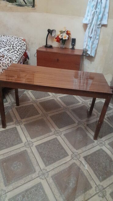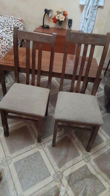 Mebel və TV dəsti - Taxta yemək/çay masası: klassik düzbucaqlı forma, parlaq taxta üst səth. 4 möhkəm ayaq, sadə və zərif dizayn. - 2 ədəd taxta stol: arxası şaquli lamelli, yuxarı hissədə oyma na...