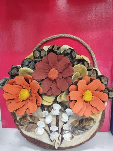 Dəniz qabıqlarından dekorativ asılqan vaza - Material: taxta korpus, üstü xırda qum və qabıqla işlənmiş dekor; ön hissədə dəniz qabıqlarından hazırlanmış gül kompozisiyası - Ölçü: orta hündürlükdə,...