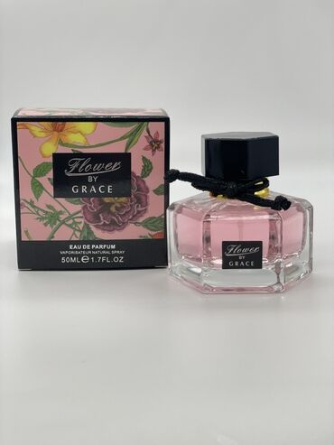 - Qablaşdırma: Çəhrayı çalarlarla floral dizaynlı qutu; şüşə flakon altıbucaqlı formadadır, qara qapaq və etiketlə.