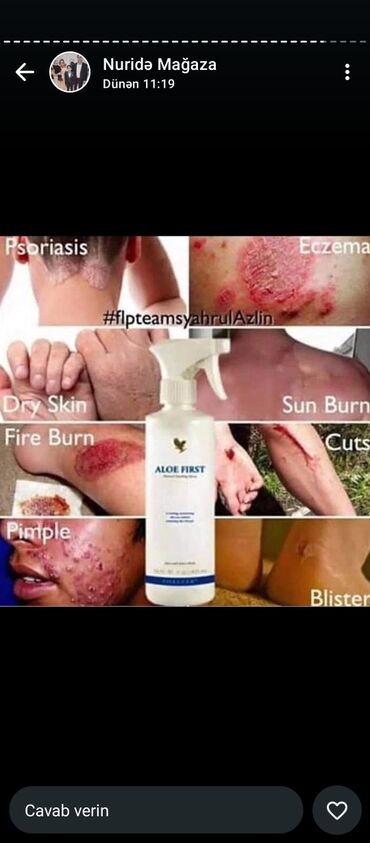 - Aloe First spreyi: Aloe vera əsaslı çoxməqsədli dəridə istifadə üçün sprey. Etiketdə göstərilən istifadələr: günəş yanıqları, yanıq izləri (fire burn), xırda kəsiklər (cuts), sızanaq (pimple), quru dəri (dry skin), qabarcıq (blister), psoriazis və ekzema üçün dəriyə tətbiq olunan dəstək spreyi. Rahat püskürdürücü başlıq, böyük həcimli butulka.