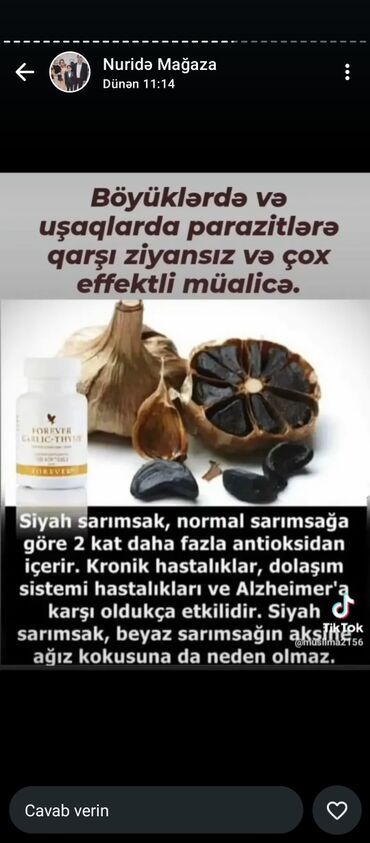 - Forever Garlic-Thyme: Sarımsaq və kəklikotu tərkibli kapsul. Vizual məlumatda “böyüklərdə və uşaqlarda parazitlərə qarşı ziyansız və çox effektli müalicə” ifadəsi yer alır. Qara sarımsağın adi sarımsağa nisbətən daha çox antioksidant ehtiva etməsi barədə məlumat göstərilib.