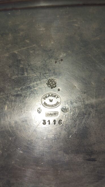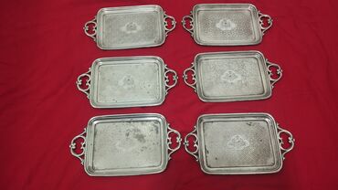 Fraget (Warszawa) markalı, qalaylı/nikellənmiş misdən (GALW.) hazırlanmış 6 ədəd kiçik düzbucaqlı servir qabı dəsti.Qacar dövlətinin emblemi ortasında Qacar dövləti üçün istehsal olunmuşdur