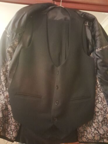 Kişi üçlü kostyum dəsti .Demək olar Yeni kimidi - Rəng: tünd boz, xırda teksturalı parça - Dəst: pencək + jilet + şalvar + köynək+qalstuk - Pencək: 2 düyməli, notched yaxalıq; bir sinə cibinin qap...