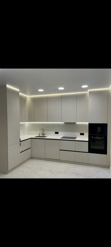 Mətbəx mebeli dizayn və hazırlanması - Minimalist, müasir üslubda L formalı və düz xəttli layihələr - Mat və ya yarımat fasadlar: boz, bej, qrafit, ağ və taxta teksturalı variantlar - Handless (gi...