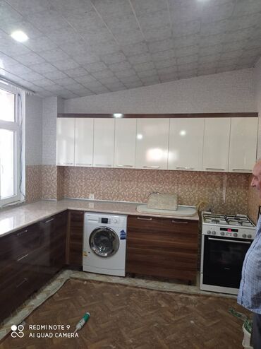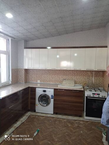 - İkinci nümunədə ağ parlaq üst fasadlar + qəhvəyi ağac teksturlu alt dolabların kombinasiyası