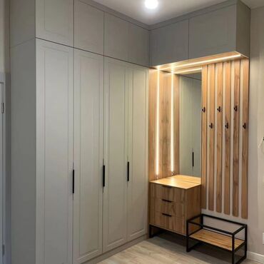 - Dəhliz sistemi: dolab bloku, asılqan panelləri, LED işıqlandırmalı güzgü zonası, çəkmə çəkməcəli konsol və ayaqqabılıq üçün metal karkaslı oturacaq.