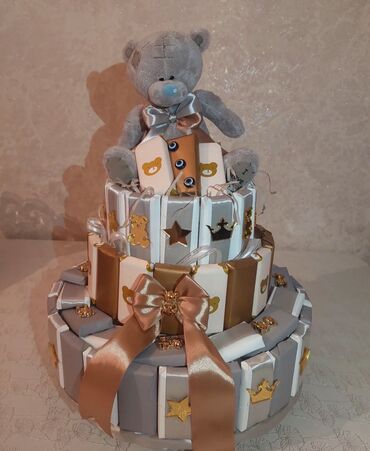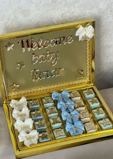 - Mövzu və mətnə uyğun fərdiləşdirilmiş şokolad qutuları: qapaqda 3D yazılar (məs., “Welcome baby …”, adlar), ulduz, bulud, günəş, ayı fiqurları, atlas və tül güllər, tematik lentlər, kiçik oyuncaqlar.