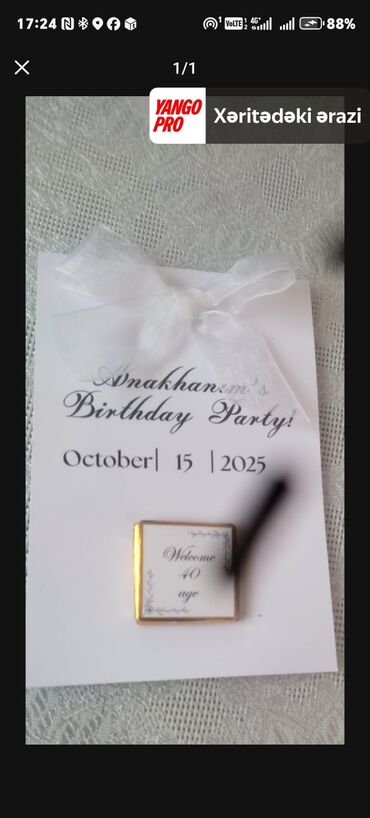- Dəvət-kartı tipli kiçik hədiyyələr: üstündə lentli kart, tarix və tədbir yazısı olan mini şokolad.