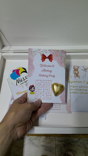 - Tədbiq sahələri: ad günü partiləri üçün “welcome” kartı, dəvətnamə, şirinlik stoluna dekor, qonaqlara hədiyyəlik.