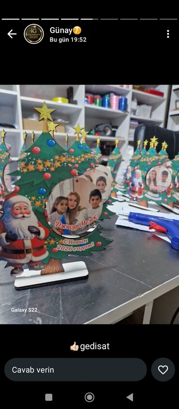 - Şəkilli masaüstü dekor: şam ağacı formalı, Şaxta baba və ulduz detallı, dairəvi hissədə şəxsi foto yerləşdirilir. Altlıqla stolüstü istifadə üçün uyğundur. Üzərində “С Новым 2026 годом!” tipli bayram yazıları tətbiq olunur.