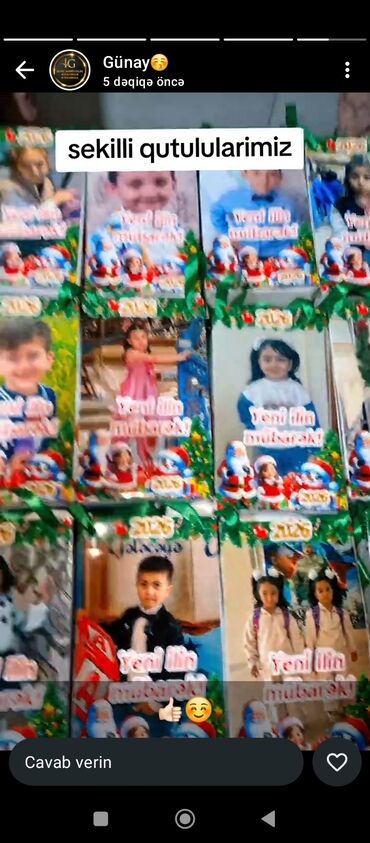 - Şəkilli qutular: üz qabığında uşaqların fotosu və “Yeni ilin mübarək!” yazısı, ətrafı şən Yeni il elementləri ilə bəzədilir. Hədiyyə və şirniyyatlar üçün nəzərdə tutulur.