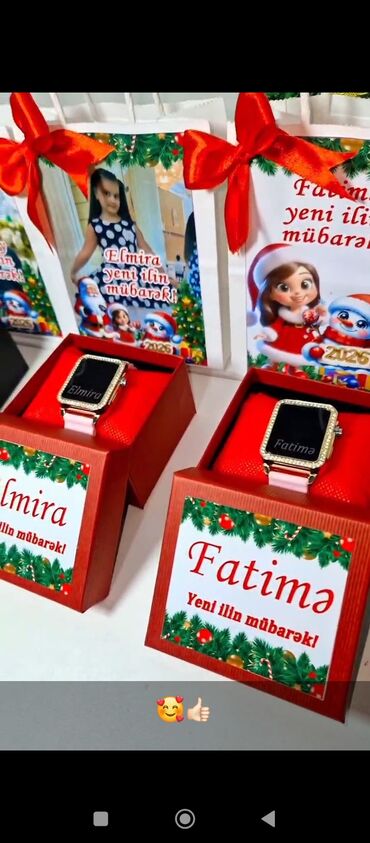 - Şəxsi ad yazılı qol saatları üçün bayram üslubunda qutular: qutunun üzərində uşaq adı və təbrik mətni, içəridə parlaq çərçivəli kvadrat displeyli saat; arxa fonda şəxsi foto ilə yeni il təbrik kartları.