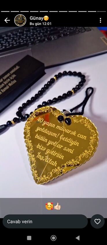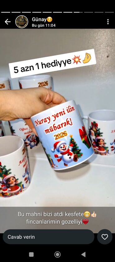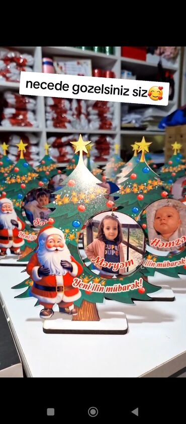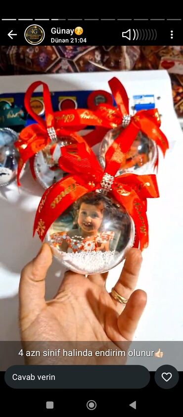 - Foto ilə bəzədilən şüşə oyuncaqlar: şəklin içəridə yerləşdirildiyi şəffaf kürə, içində qarlı effekt üçün xırda ağ muncuqlar; üstü parlaq daşlı bəzək və qırmızı lentlə tamamlanır. Üzərində “4 azn sinif halında endirim olunur” qeydi görünür.