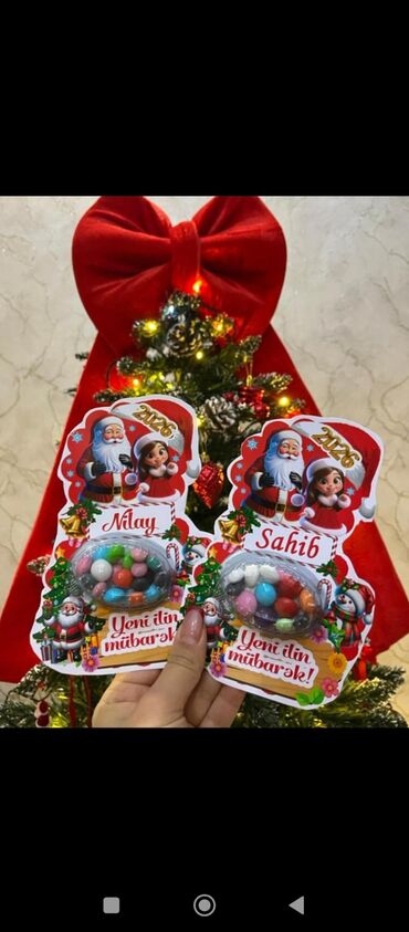 - Adla fərdiləşdirilən mini şirniyyat kartları: Santa və qış mövzulu açıqcalar, üzərində uşaq adı, “Yeni ilin mübarək!” yazısı və içində şəffaf kapsulda rəngbərəng draje konfetlər.